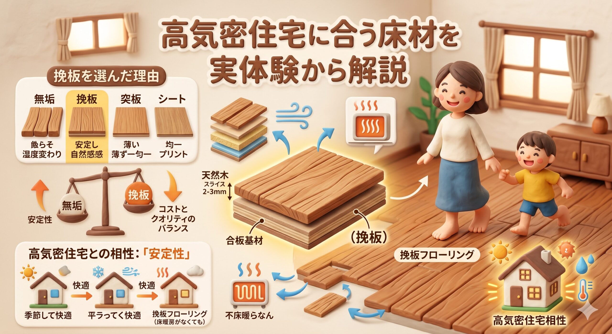 家づくりを進めると、無垢フローリングへの憧れが芽生える方は多いはずです。天然木の温もり、素足で踏んだときの柔らかな質感——それは確かに魅力的です。でも、「反る」「隙間ができる」「手入れが大変」という声もよく聞きます。私自身も最後まで悩んだ末に選んだのが「挽板フローリング」でした。その選択理由と、高気密高断熱住宅との相性についてお伝えします。